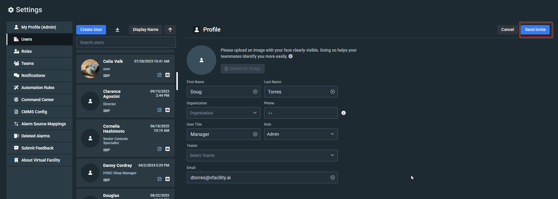 Upon completion, click "Send Invite" to dispatch an email invitation for the user to join Virtual Facility.