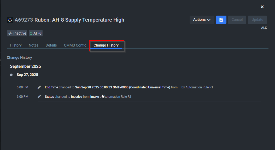 The Alarm Change History section on the alarm flyout lists all the changes made to the alarm, including changes to alarm priority, status, and detail fields.