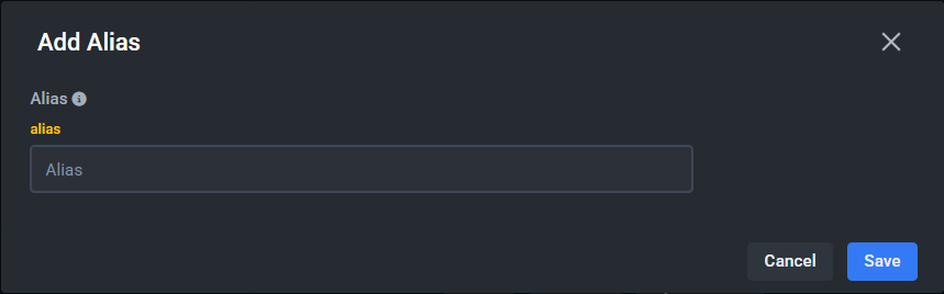 After filling in the required fields in the Create Asset slideout, click the "+ Add Alias" button at the bottom.  This will open the Add Alias modal. Enter the alias exactly, then click Save. This alias will appear in the Aliases area of the slideout.